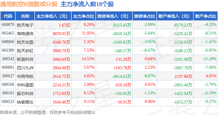 资金流向方面,通用航空R(480076)指数成份股当日主力资金净流出合计4555.44万元,游资资金净流出合计1.67亿元,散户资金净流入合计2.12亿元。成份股资金流向详情见下表: