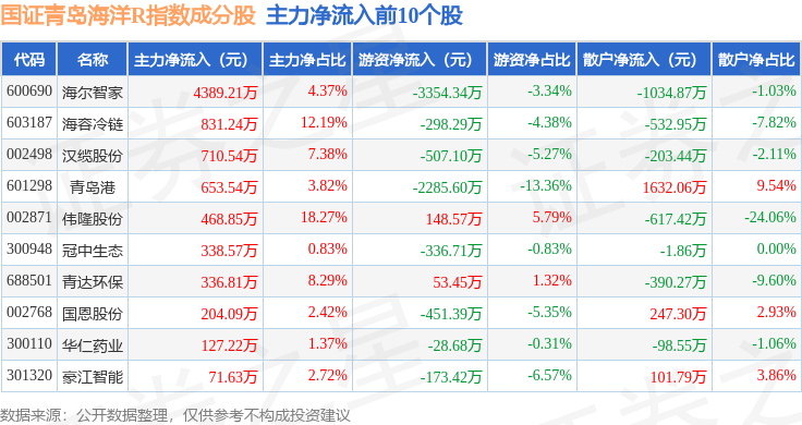 资金流向方面,国证青岛海洋R(480532)指数成份股当日主力资金净流出合计7692.67万元,游资资金净流出合计1.06亿元,散户资金净流入合计1.71亿元。成份股资金流向详情见下表: