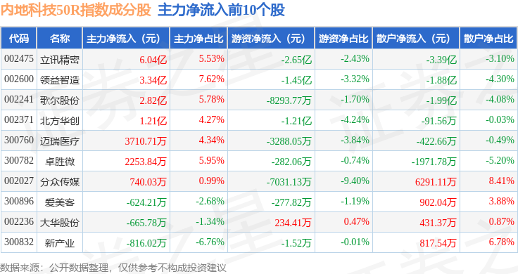 资金流向方面,内地科技50R(483003)指数成份股当日主力资金净流出合计36.95亿元,游资资金净流入合计7.48亿元,散户资金净流入合计29.47亿元。成份股资金流向详情见下表: