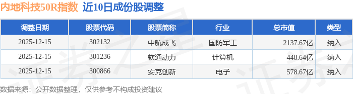 近10日内内地科技50R(483003)指数成份股做了调整,新纳入了3只股票。