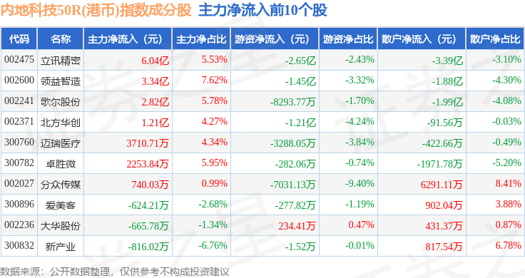 资金流向方面,内地科技50R(港币)(483004)指数成份股当日主力资金净流出合计36.95亿元,游资资金净流入合计7.48亿元,散户资金净流入合计29.47亿元。成份股资金流向详情见下表: