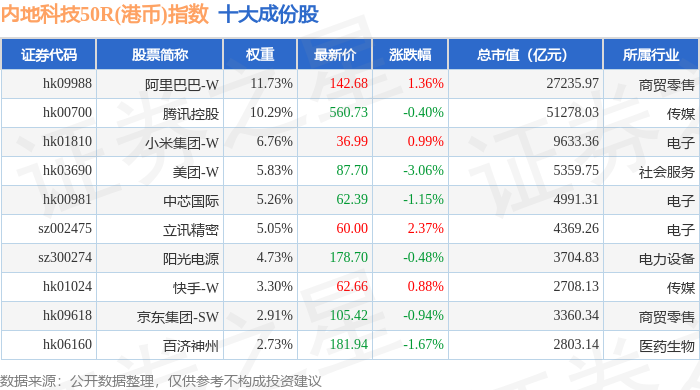 内地科技50R(港币)(483004)指数十大成份股详情如下: