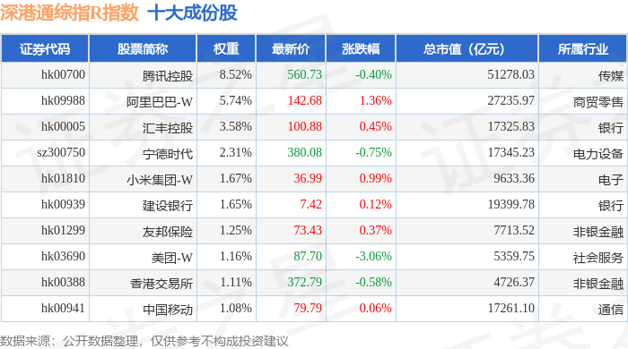 深港通综指R(483005)指数十大成份股详情如下: