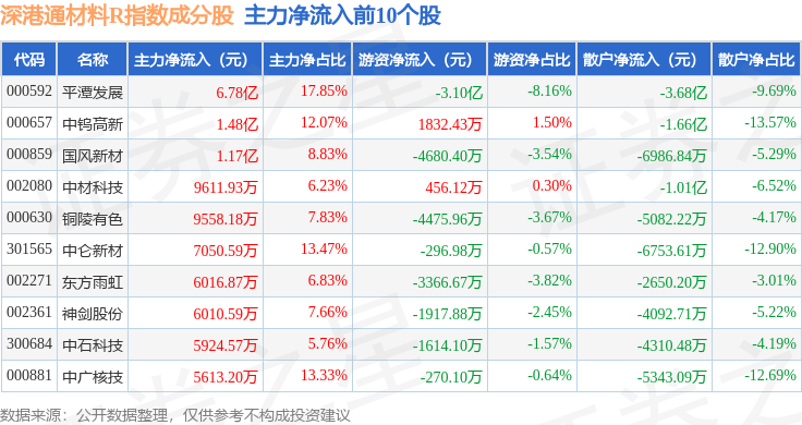 资金流向方面,深港通材料R(483015)指数成份股当日主力资金净流出合计31.53亿元,游资资金净流出合计6605.92万元,散户资金净流入合计32.19亿元。成份股资金流向详情见下表: