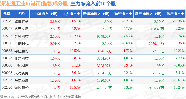 资金流向方面,深港通工业R(港币)(483018)指数成份股当日主力资金净流出合计51.62亿元,游资资金净流入合计6.94亿元,散户资金净流入合计44.68亿元。成份股资金流向详情见下表: