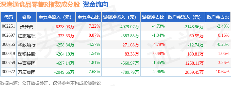 资金流向方面,深港通食品零售R(483037)指数成份股当日主力资金净流入合计3282.03万元,游资资金净流出合计5459.25万元,散户资金净流入合计2177.22万元。成份股资金流向详情见下表: