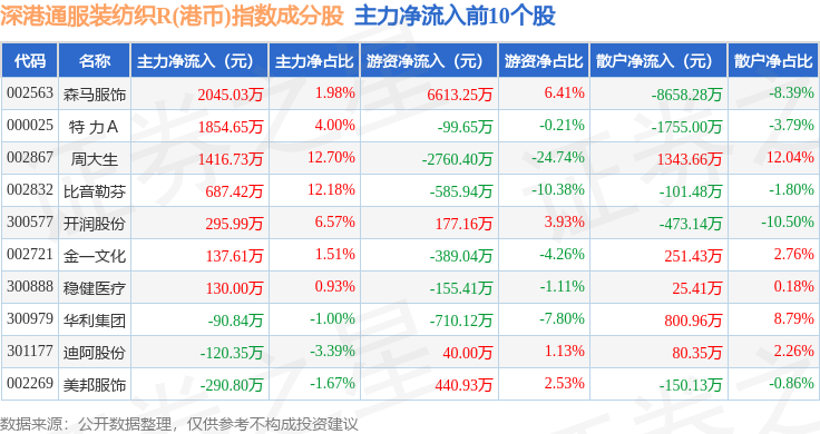 资金流向方面,深港通服装纺织R(港币)(483042)指数成份股当日主力资金净流出合计2.9亿元,游资资金净流入合计1.41亿元,散户资金净流入合计1.49亿元。成份股资金流向详情见下表:
