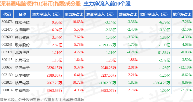 资金流向方面,深港通电脑硬件R(港币)(483044)指数成份股当日主力资金净流出合计31.61亿元,游资资金净流入合计2.36亿元,散户资金净流入合计29.25亿元。成份股资金流向详情见下表: