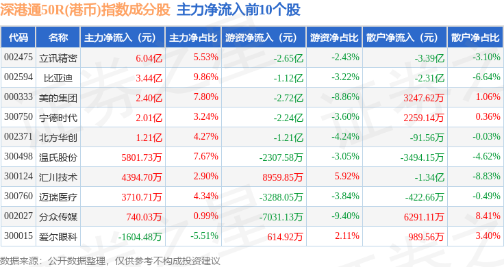 资金流向方面,深港通50R(港币)(483092)指数成份股当日主力资金净流出合计12.84亿元,游资资金净流出合计2.06亿元,散户资金净流入合计14.89亿元。成份股资金流向详情见下表:
