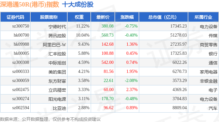 深港通50R(港币)(483092)指数十大成份股详情如下: