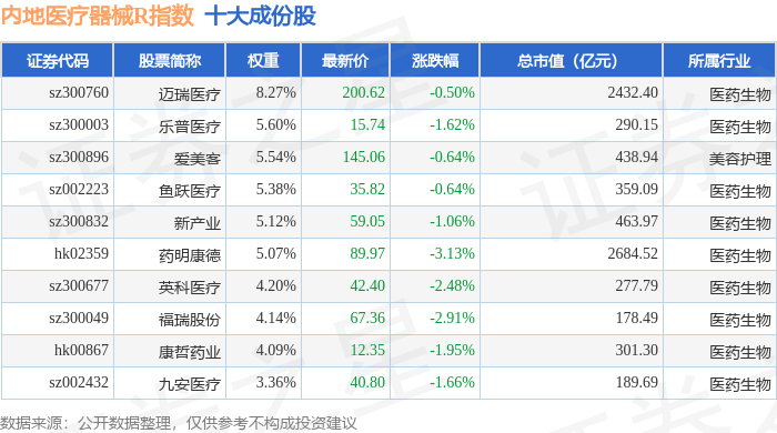 内地医疗器械R(483103)指数十大成份股详情如下: