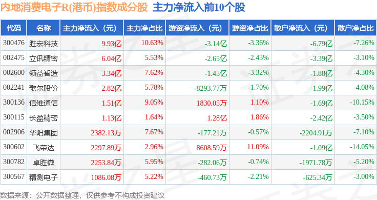 资金流向方面,内地消费电子R(港币)(483106)指数成份股当日主力资金净流入合计7.75亿元,游资资金净流出合计4.28亿元,散户资金净流出合计3.47亿元。成份股资金流向详情见下表: