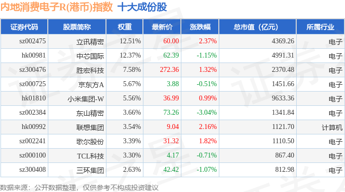 内地消费电子R(港币)(483106)指数十大成份股详情如下: