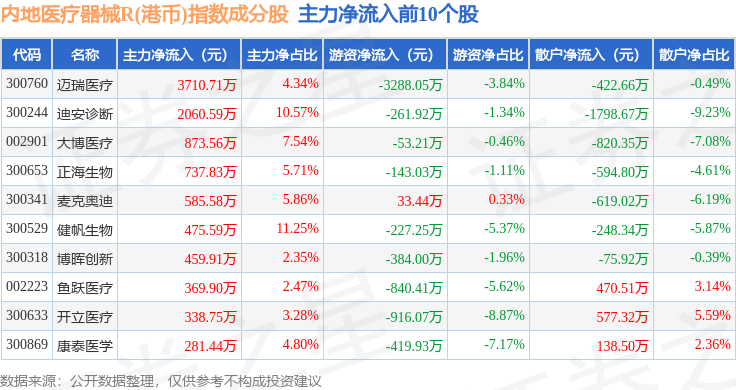 资金流向方面,内地医疗器械R(港币)(483104)指数成份股当日主力资金净流出合计1.71亿元,游资资金净流入合计1171.47万元,散户资金净流入合计1.59亿元。成份股资金流向详情见下表: