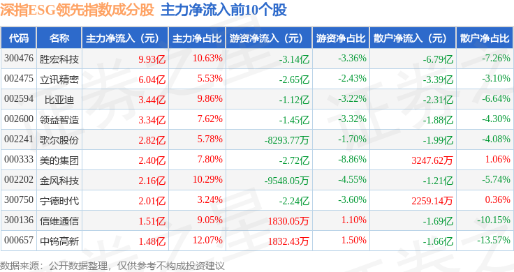 资金流向方面,深指ESG领先(970029)指数成份股当日主力资金净流出合计93.54亿元,游资资金净流入合计14.91亿元,散户资金净流入合计78.62亿元。成份股资金流向详情见下表: