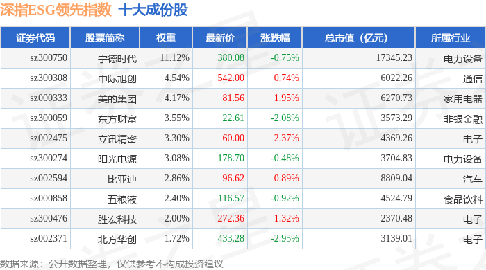 证券之星消息,12月2日,深指ESG领先(970029)指数报收于13911.51点,跌0.63%,成交2065.33亿元,换手率1.16%。当日该指数成份股中,上涨的有48家,迈为股份以4.6%的涨幅领涨,下跌的有151家,雅化集团以4.19%的跌幅领跌。