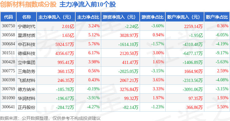 资金流向方面,创新材料(970039)指数成份股当日主力资金净流出合计11.48亿元,游资资金净流入合计8511.1万元,散户资金净流入合计10.63亿元。成份股资金流向详情见下表: