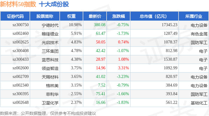 证券之星消息,12月2日,新材料50(970042)指数报收于3596.13点,跌1.04%,成交553.61亿元,换手率2.4%。当日该指数成份股中,上涨的有7家,星源材质以5.13%的涨幅领涨,下跌的有40家,鹏辉能源以5.0%的跌幅领跌。