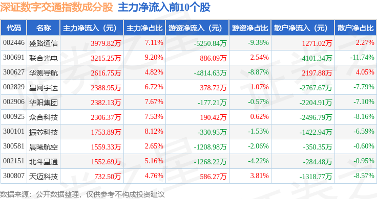 资金流向方面,深证数字交通(970049)指数成份股当日主力资金净流出合计15.03亿元,游资资金净流入合计4.66亿元,散户资金净流入合计10.37亿元。成份股资金流向详情见下表: