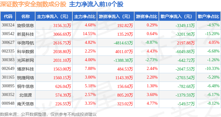 资金流向方面,深证数字安全(970052)指数成份股当日主力资金净流出合计10.85亿元,游资资金净流入合计2.86亿元,散户资金净流入合计7.99亿元。成份股资金流向详情见下表: