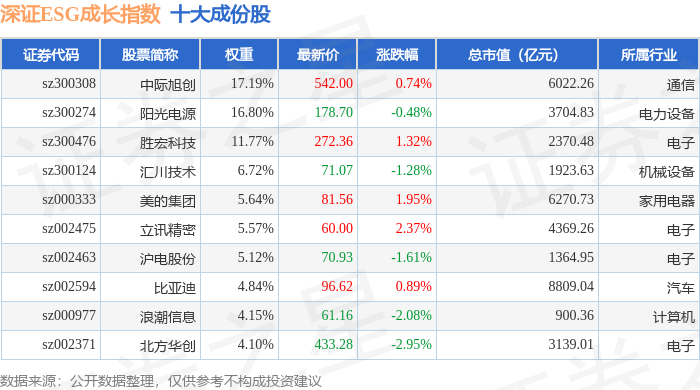 证券之星消息,12月2日,深证ESG成长(970060)指数报收于2213.7点,跌0.11%,成交761.17亿元,换手率1.4%。当日该指数成份股中,上涨的有12家,立讯精密以2.37%的涨幅领涨,下跌的有38家,光库科技以4.53%的跌幅领跌。