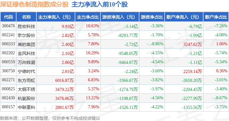 资金流向方面,深证绿色制造(970069)指数成份股当日主力资金净流出合计47.44亿元,游资资金净流入合计5.23亿元,散户资金净流入合计42.22亿元。成份股资金流向详情见下表: