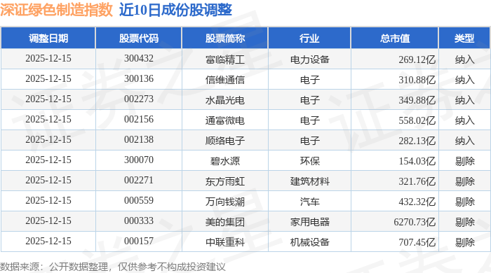 近10日内深证绿色制造(970069)指数成份股做了调整,新纳入了5只股票,剔除了5只股票。