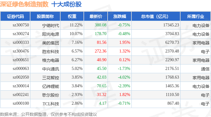 深证绿色制造(970069)指数十大成份股详情如下: