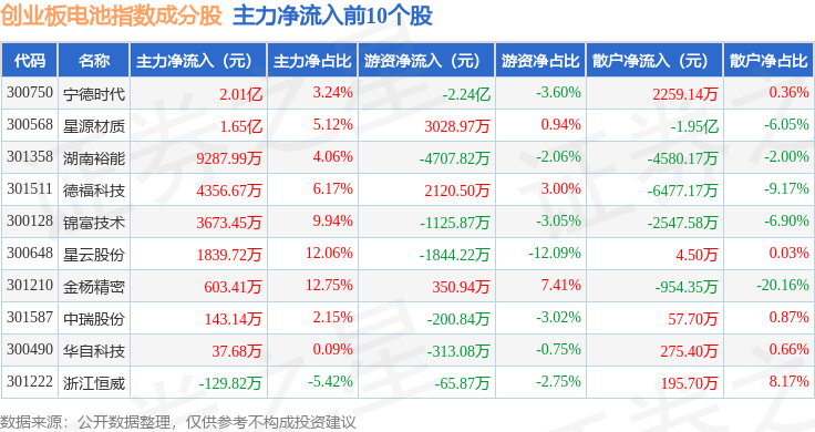 资金流向方面,创业板电池(970081)指数成份股当日主力资金净流出合计12.56亿元,游资资金净流出合计3.01亿元,散户资金净流入合计15.57亿元。成份股资金流向详情见下表:
