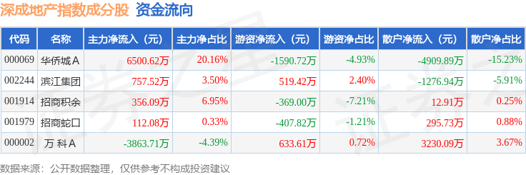 资金流向方面,深成地产(971001)指数成份股当日主力资金净流入合计3862.61万元,游资资金净流出合计1214.51万元,散户资金净流出合计2648.1万元。成份股资金流向详情见下表: