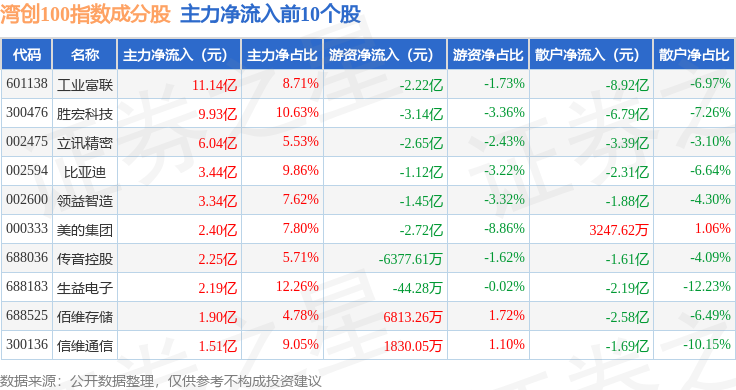 资金流向方面,湾创100(980001)指数成份股当日主力资金净流出合计19.69亿元,游资资金净流入合计10.8亿元,散户资金净流入合计8.89亿元。成份股资金流向详情见下表: