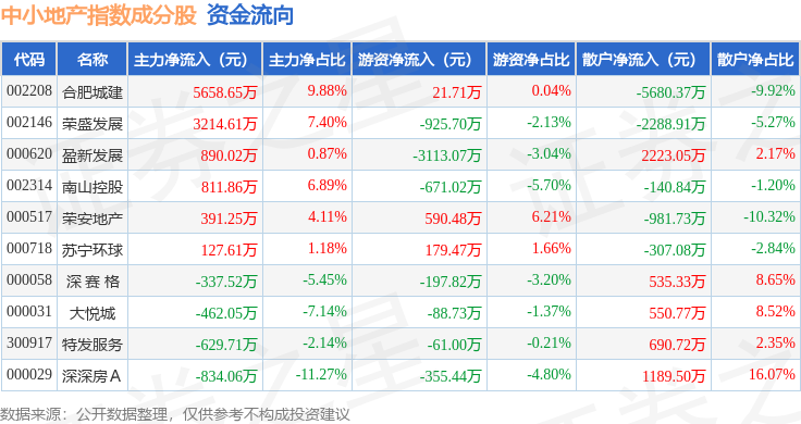 资金流向方面,中小地产(971002)指数成份股当日主力资金净流入合计8830.67万元,游资资金净流出合计4621.12万元,散户资金净流出合计4209.55万元。成份股资金流向详情见下表:
