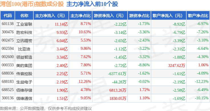 资金流向方面,湾创100(港币)(980002)指数成份股当日主力资金净流出合计19.69亿元,游资资金净流入合计10.8亿元,散户资金净流入合计8.89亿元。成份股资金流向详情见下表: