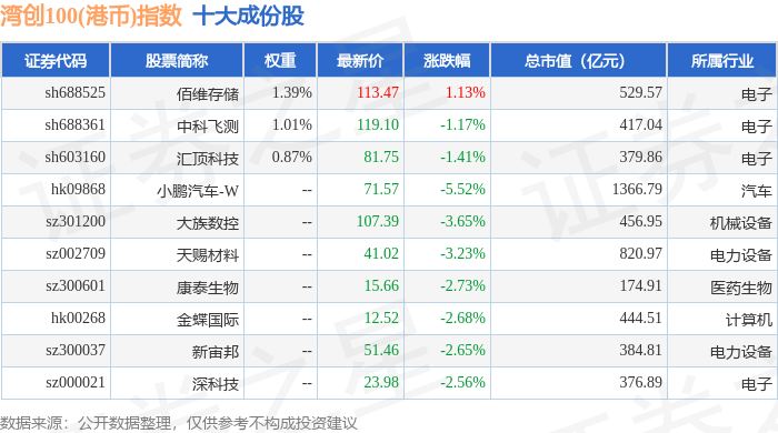 湾创100(港币)(980002)指数十大成份股详情如下: