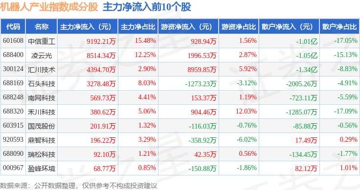 资金流向方面,机器人产业(980022)指数成份股当日主力资金净流出合计9.79亿元,游资资金净流入合计3.46亿元,散户资金净流入合计6.31亿元。成份股资金流向详情见下表: