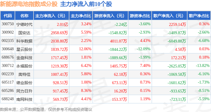 资金流向方面,新能源电池(980027)指数成份股当日主力资金净流出合计15.28亿元,游资资金净流入合计2.36亿元,散户资金净流入合计12.92亿元。成份股资金流向详情见下表: