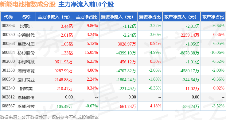 资金流向方面,新能电池(980032)指数成份股当日主力资金净流出合计25.75亿元,游资资金净流出合计1460.77万元,散户资金净流入合计25.43亿元。成份股资金流向详情见下表: