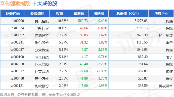文化创意(980046)指数十大成份股详情如下: