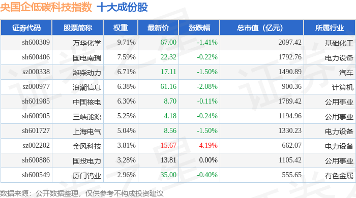央国企低碳科技(980082)指数十大成份股详情如下: