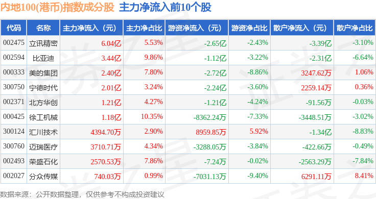 资金流向方面,内地100(港币)(983002)指数成份股当日主力资金净流出合计70.79亿元,游资资金净流入合计12.12亿元,散户资金净流入合计58.66亿元。成份股资金流向详情见下表: