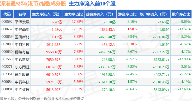 资金流向方面,深港通材料(港币)(983016)指数成份股当日主力资金净流出合计31.53亿元,游资资金净流出合计6605.92万元,散户资金净流入合计32.19亿元。成份股资金流向详情见下表: