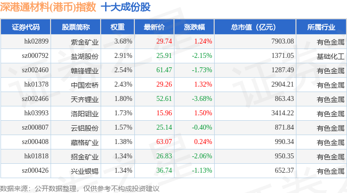 深港通材料(港币)(983016)指数十大成份股详情如下: