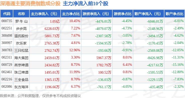 资金流向方面,深港通主要消费(983021)指数成份股当日主力资金净流出合计8.15亿元,游资资金净流入合计2.43亿元,散户资金净流入合计5.71亿元。成份股资金流向详情见下表: