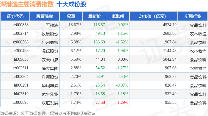 深港通主要消费(983021)指数十大成份股详情如下: