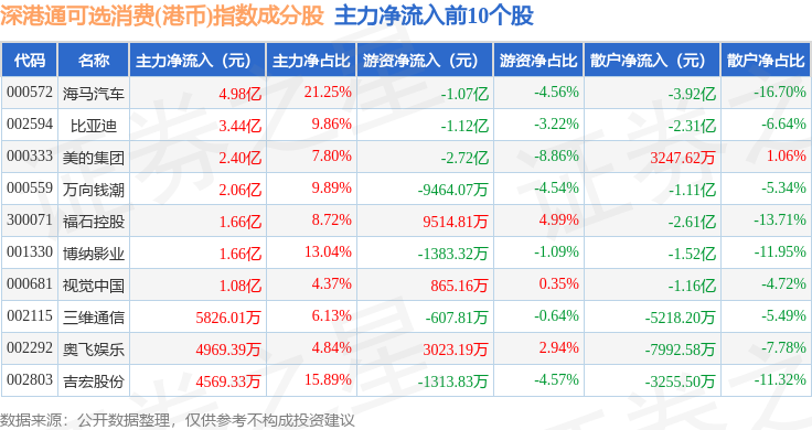 资金流向方面,深港通可选消费(港币)(983020)指数成份股当日主力资金净流出合计31.12亿元,游资资金净流入合计2.35亿元,散户资金净流入合计28.77亿元。成份股资金流向详情见下表: