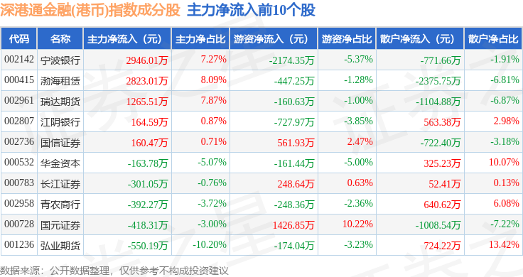 资金流向方面,深港通金融(港币)(983026)指数成份股当日主力资金净流出合计15.67亿元,游资资金净流入合计4.86亿元,散户资金净流入合计10.81亿元。成份股资金流向详情见下表: