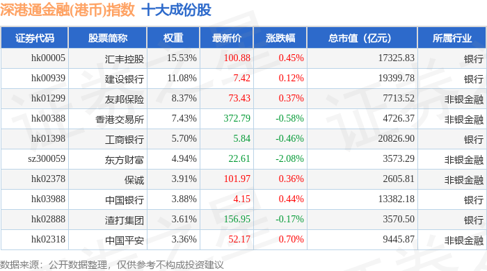 深港通金融(港币)(983026)指数十大成份股详情如下: