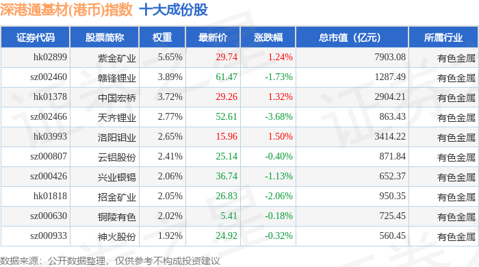 深港通基材(港币)(983062)指数十大成份股详情如下: