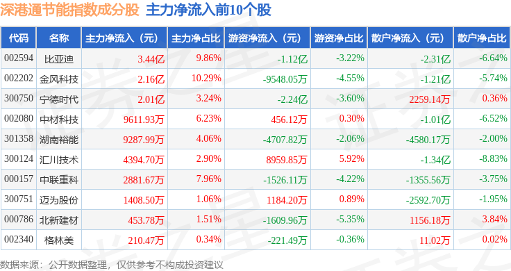资金流向方面,深港通节能(983085)指数成份股当日主力资金净流出合计20.49亿元,游资资金净流入合计4303.55万元,散户资金净流入合计20.06亿元。成份股资金流向详情见下表: