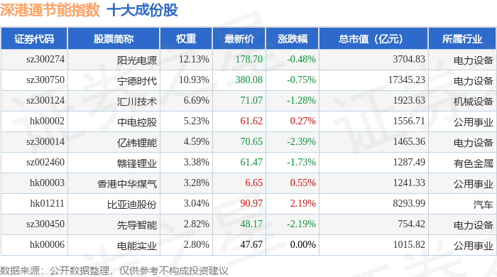 证券之星消息,12月2日,深港通节能(983085)指数报收于2271.41点,跌0.73%,成交529.5亿元,换手率0.75%。当日该指数成份股中,上涨的有17家,迈为股份以4.6%的涨幅领涨,下跌的有31家,天齐锂业以3.68%的跌幅领跌。